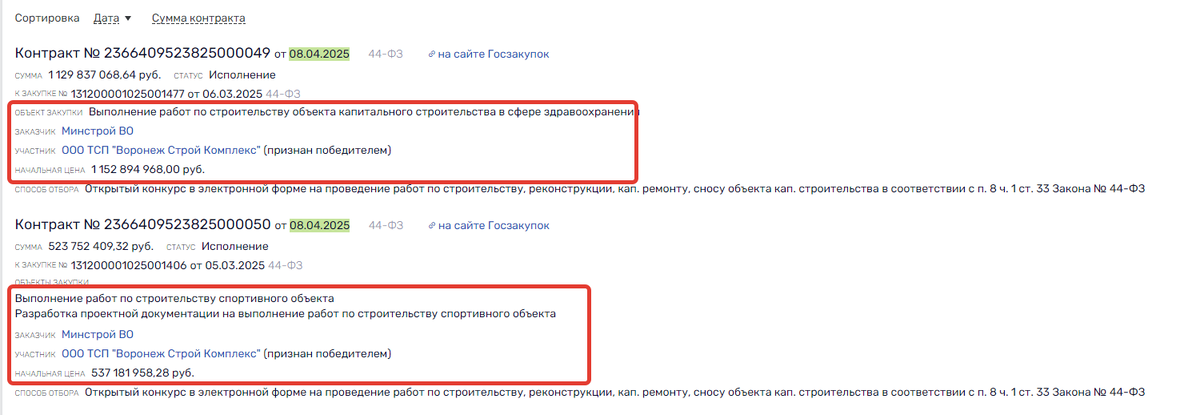 скншот из открытых источников, информация по двум апрельским контрактам между Минстроем и ООО ТСП «Воронеж Строй Комплекс». В контракте записана сумма 523,7 млн рублей, а сайте госзакупок значится уже 537,1 млн рублей. Получается, за неделю объект подорожал на 14 млн.