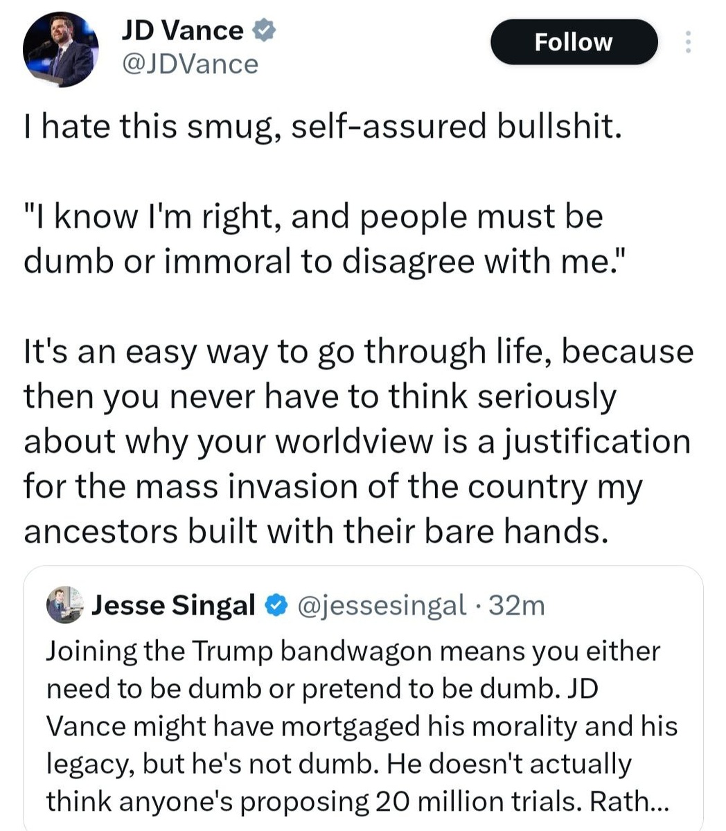 Vice Prez Vance goes on the offensive for all to see on X He is standing up for his views against the 'mass invasion of country that my ancestors built with their bare hands'