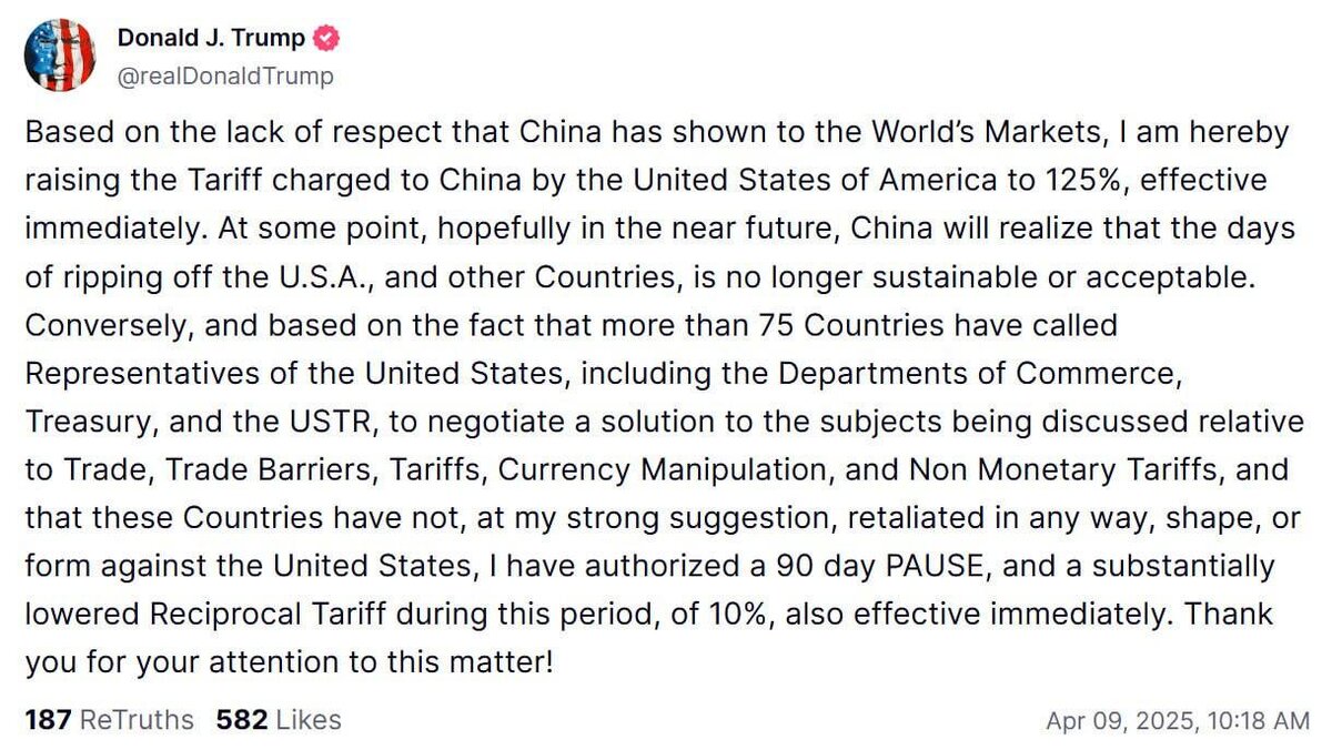 В ответ на пост Трамп заявил о повышении тарифов для Китая до 125% Президент США Дональд Трамп заявил о повышении тарифов на импортные товары из Китая до 125%, тогда как ранее заявлялось о ставке в 104%. Как заявляет Bloomberg, при этом тарифы для остальных стран, ранее объявленные Трампом поставлены на 90-дневную паузу. На это время будут действовать ставки в 10%. ✍️Подписывайтесь на t.me/CentralMediaNews