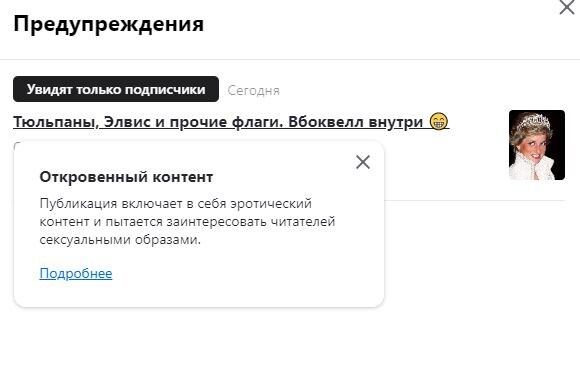 Ха-ха. Или хи-хи? что звучит более нервно? Почему? А вот: Когда знаменитые дизайнеры побуквенно печатают в текстах непечатные слова - это другое. Когда крупное СМИ ставит фото, на которое нельзя смотреть без содрогания, это другое. А тут принцесса Диана на официальных фотографиях - откровенный контент. Да там моё оправдание по поводу донатов звучит более откровенно. Правда, в самом прямом смысле слова, которое про искренность и правду. Ну-ну... Будем ждать, что скажут. Кстати, эти ограничения ведут к отрезанию даже тех копеек, что начисляют. 🤣🤣🤣 Написала в техподдержку. Жду, что скажут. Пусть пальцем ткнут, чего там не так, а то я Ш не знаю.