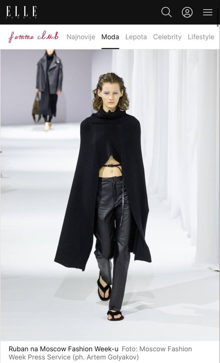 В рубрику «айтем дня» сегодня залетает пончо из коллекции бренда RUBAN, представленной на Московской неделе моды. К слову, эта модель стала одной из самых актуальных по версии издания Elle (Сербия), которое отметило инновационный подход в вязании и универсальность при стилизации. Так что берите на заметку — учитывая прогноз погоды в столице на ближайшую неделю, это изделие точно станет незаменимым дополнением для вашего образа. Кстати, из актуального для этого периода команда издания также выделила с подиума Московской недели моды вязаный свитер от AMMONIT (Москва) и трикотажные изделия от Alpe Cashmere (Москва).