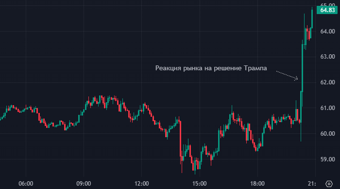 Вечером среды мировые рынки подскочили на новости о том, что Трамп поставил на 90-дневную паузу тарифы против стран, которые не ответили на тарифы США. Кроме того, в этот период времени в отношении таких стран будет действовать пониженная ставка в 10%. Нефть Brent интервалами 5 минут Вечером среды мировые рынки подскочили на новости о том, что Трамп поставил на 90-дневную паузу тарифы против стран, которые не ответили на тарифы США. Кроме того, в этот период времени в отношении таких стран будет действовать пониженная ставка в 10%. «Исходя из недостатка уважения, которое Китай показал мировым рынкам, я настоящим немедленно повышаю пошлины, которые США взимает с Китая, до 125%. В какой-то момент, надеюсь в скором будущем, Китай поймет, что времена, когда он обкрадывал США и другие страны, больше невозможны и неприемлемы», — написал президент США в соцсети Truthsocial. —«Наоборот, и, исходя из того факта, что свыше 75 стран позвонили представителям США, включая министерства торговли, фин