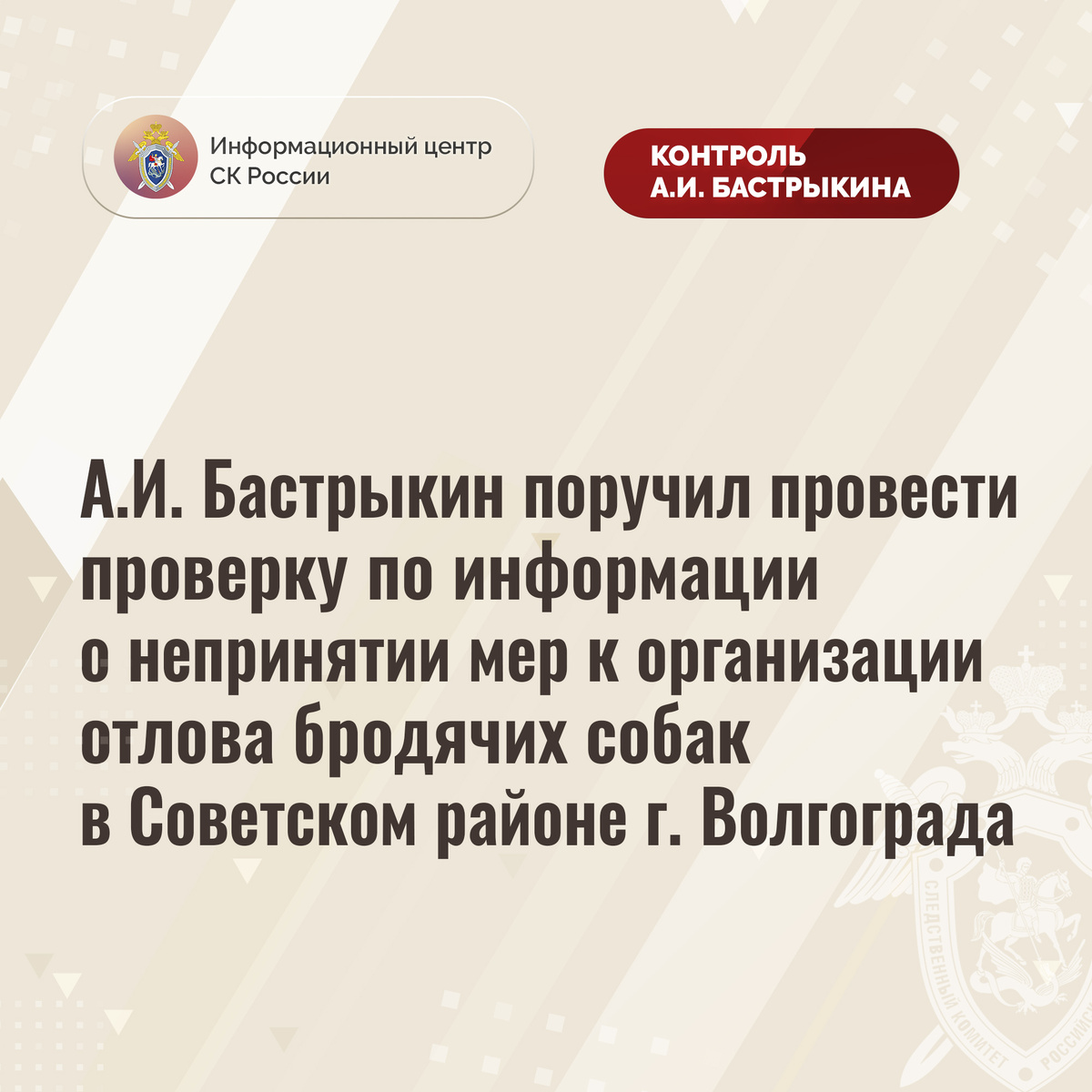 А.И. Бастрыкин поручил провести проверку по информации о непринятии мер к организации отлова бродячих собак в Советском районе г. Волгограда В приемную Председателя СК России А.И. Бастрыкина «ВКонтакте» поступило коллективное обращение от жителей города Волгограда по вопросу непринятия мер к организации отлова бродячих собак в Советском районе. Вблизи многоквартирного дома, образовательного учреждения и остановочного павильона на протяжении длительного времени обитает стая агрессивных животных, которые систематически нападают на граждан. Несмотря на многочисленные обращения пострадавших в администрацию, меры к разрешению ситуации не принимаются. Местные жители опасаются за безопасность детей. Ситуация освещалась в СМИ. Председатель Следственного комитета Российской Федерации Александр Иванович Бастрыкин поручил руководителю СУ СК России по Волгоградской области Василию Ивановичу Семенову провести процессуальную проверку и доложить об установленных в ходе первоначальных проверочных мер