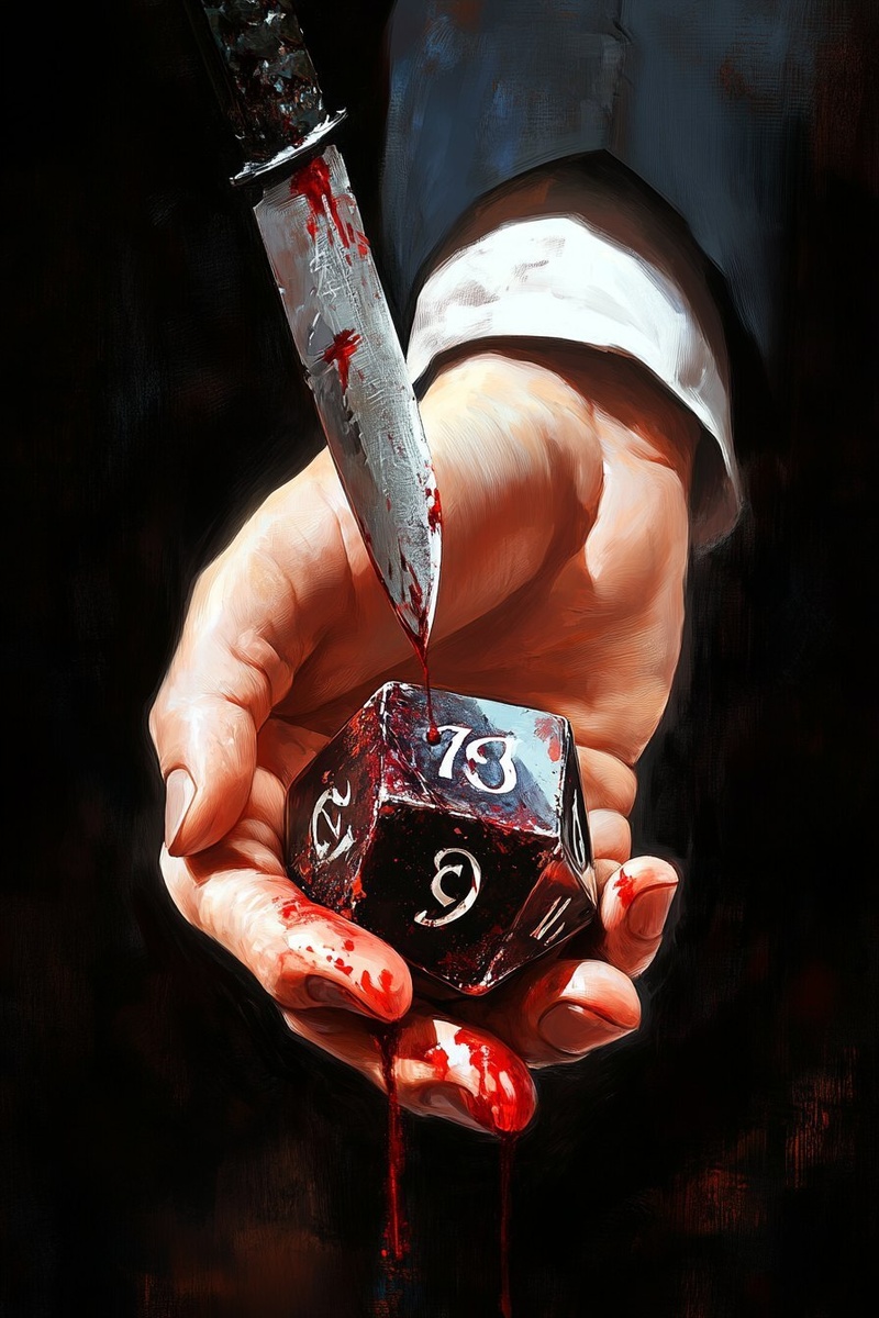 Создано на основе запроса: male hand holding a d20 die, hand if focal point, knife stabbing through the die and hand, pulp art,
