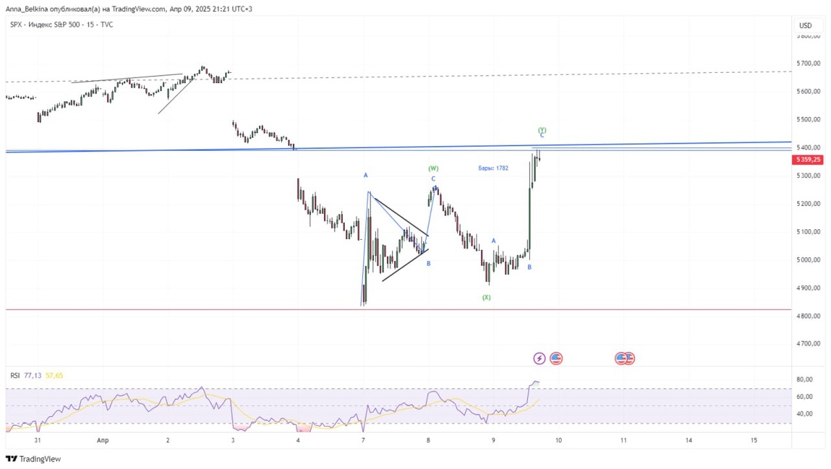 #SP500 На новостях об отсрочке тарифов индекс растет на почти 8%. Для второй волны конечной диагонали проход вниз составил всего 50%. Тогда как статистически это диапазон 61.8% - 79% Фибо. Технически, с низов импульса нет, прошел двойной зигзаг. Но стоит отметить, раз уж индекс движется в КД, то здесь именно тройки в обе стороны и наличие или отсутствие импульса не будет подсказкой. Настроения сейчас преисполнены оптимизма на фоне отсрочки. Но важно, что ответит Китай. Не является ИИР