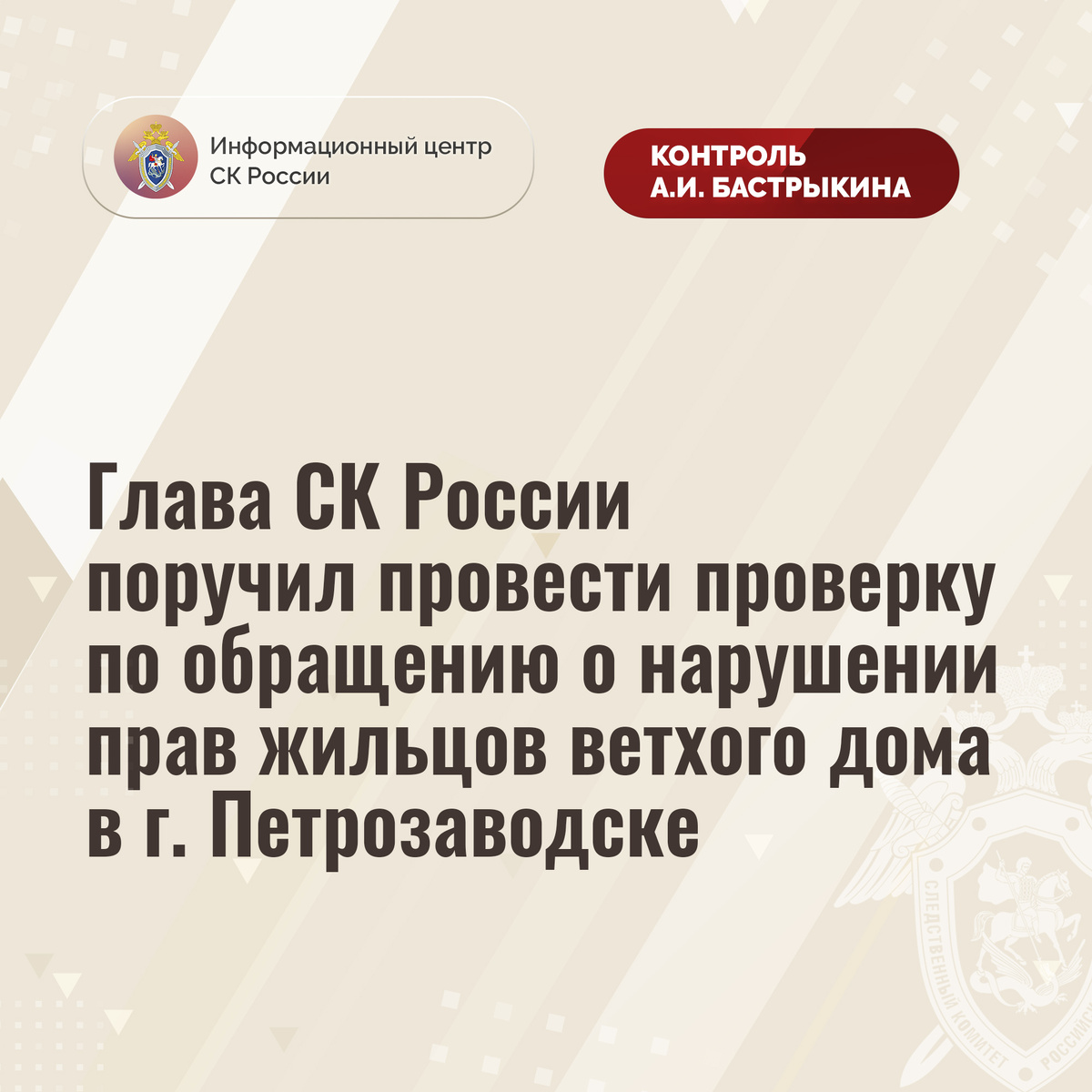 Глава СК России поручил провести проверку по обращению о нарушении прав жильцов ветхого дома в г. Петрозаводске В Информационный центр СК России обратилась многодетная мать из Республики Карелии по вопросу длительного непринятия мер к расселению жильцов многоквартирного дома по улице Профсоюзов в городе Петрозаводске. Здание, 1932 года постройки, находится в непригодном состоянии: печное оборудование не функционирует, коммуникации изношены, трубопровод регулярно промерзает, несущие конструкции разрушаются. Многочисленные обращения граждан в администрацию результатов не принесли, жильцам предлагают ожидать расселения лишь в 2032 году. Председатель Следственного комитета Российской Федерации Александр Иванович Бастрыкин поручил руководителю СУ СК России по Республике Карелии Евгению Николаевичу Швецу провести процессуальную проверку и представить доклад об установленных в ходе первоначальных проверочных мероприятий обстоятельствах, а по завершении проверки – о ее результатах. Исполнение