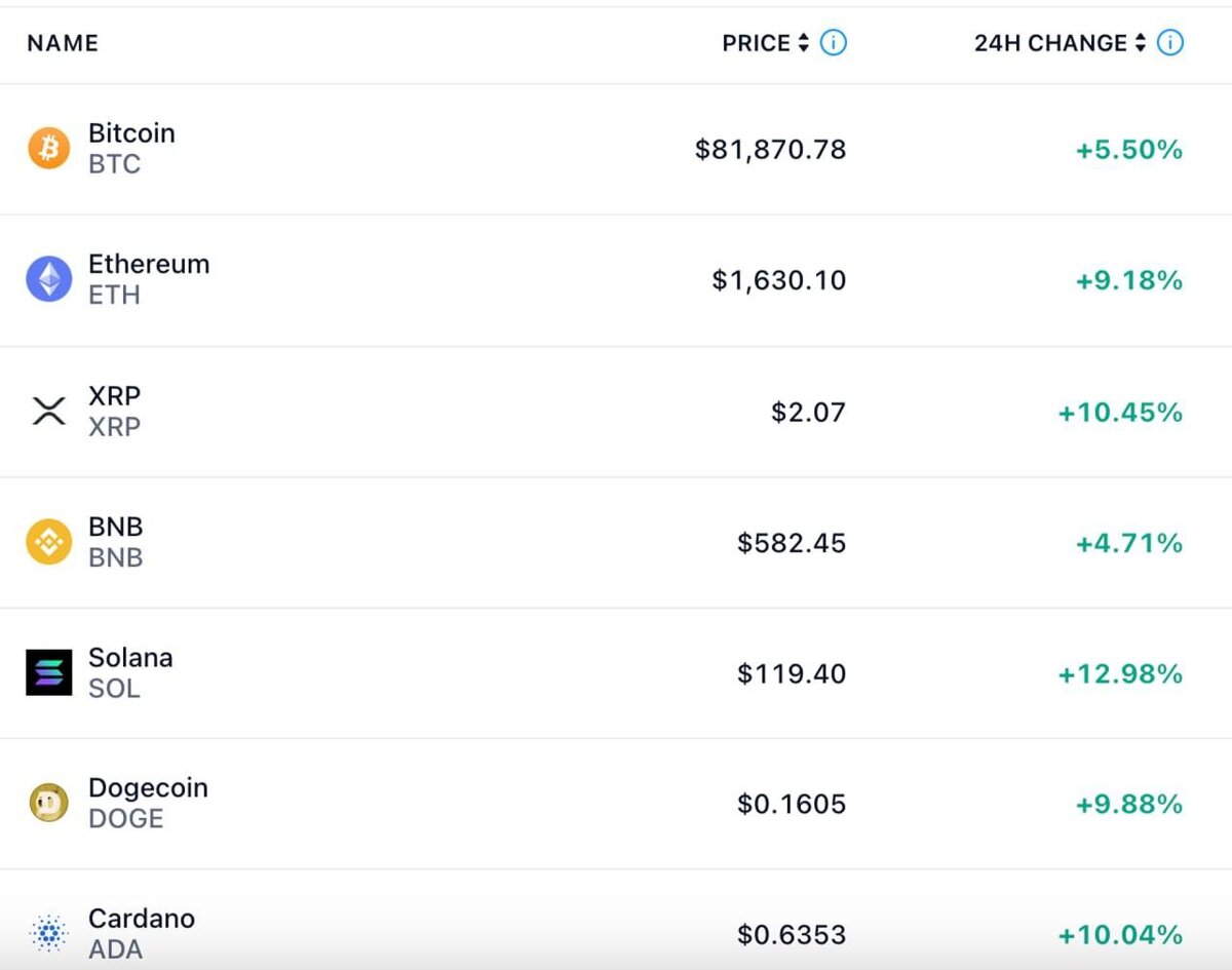 Стоимость большинства крупных криптовалют растёт после заявлений Трампа о паузе в импортных пошлинах США против ряда стран. ▪️Биткоин тем временем превысил отметку $80 тыс. ▪️Рост показывают и цены на нефть марки Brent. ▪️Индексы США взлетели на 7—8%, рост наблюдается в том числе на S&P 500. Трамп несколько часов назад в своей соцсети Truth: «Пришло время покупать». 🟩 Подписаться | Прислать новость | Читать аналитику