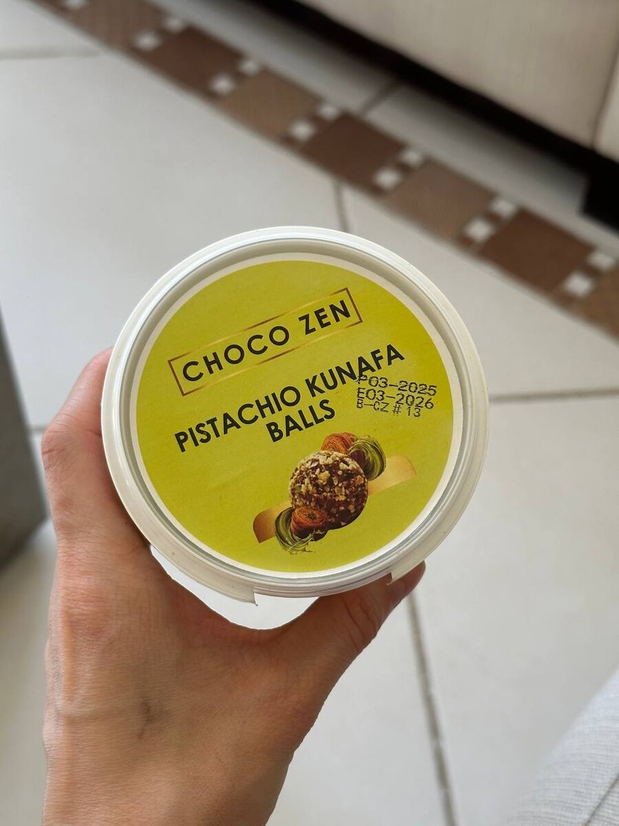 Купила этот десерт. Оказывается это шарики из фиников, а внутри фисташковая паста с катаифи. Для меня чень сладко.