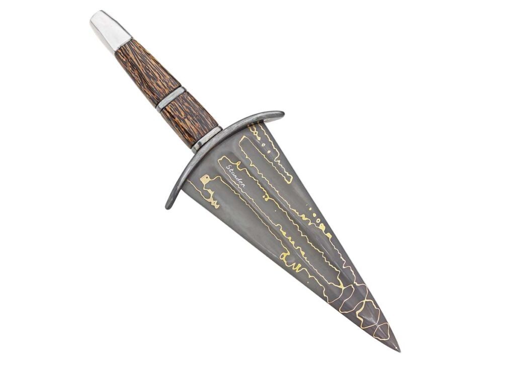 Венеция, карнавал, таинственный незнакомец в маске… и чинкведеа — широкий клинок, который в XV веке носили даже дамы (чтобы стильно разрезать письма соперниц). Репродукция Стэндена — это 21 см изысканной жестокости: многослойная сталь (1084, медно-май, снова 1084), рукоять из стабилизированной черной пальмы и медные вставки, от которых плачут даже часы Rolex. Общая длина — 35,5 см. Идеально для: а) коллекции; б) эффектного селфи; в) напоминания гостям, кто здесь главный ценитель Ренессанса.