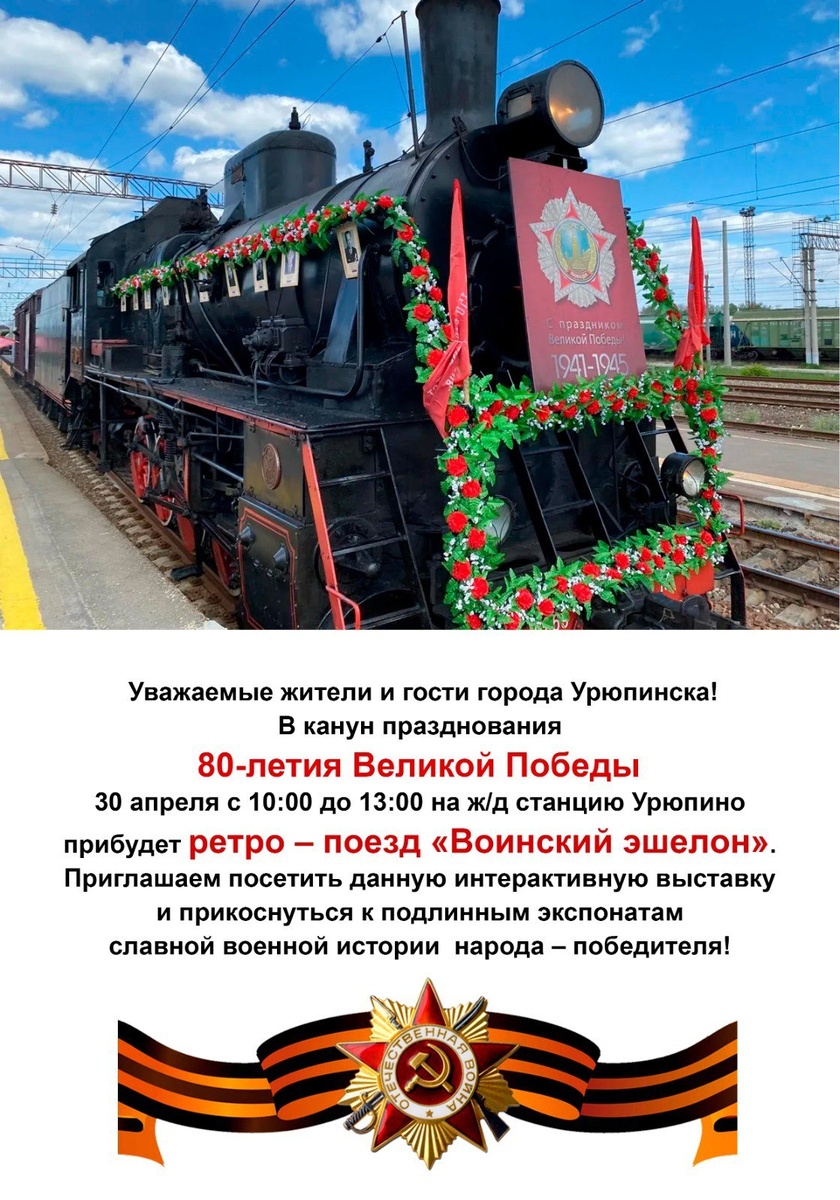 🎗🎊Уважаемые жители и гости города Урюпинска! В канун празднования 80-летия Великой Победы 📍30 апреля с 10:00 до 13:00 часов📍 на ж/д станцию Урюпино прибудет ретро – поезд «Воинский эшелон». Приглашаем посетить данную интерактивную выставку и прикоснуться к подлинным экспонатам славной военной истории народа – победителя!🎊🎗 #ВоинскийЭшелон #Ретропоезд #ГодЗащитникаОтечества #80летПобеды #ВОВ #ветераны #ДеньПобеды #АдминистрацияУрюпинска #СтолицаРоссийскойПровинции #МыПомним #МыГордимся