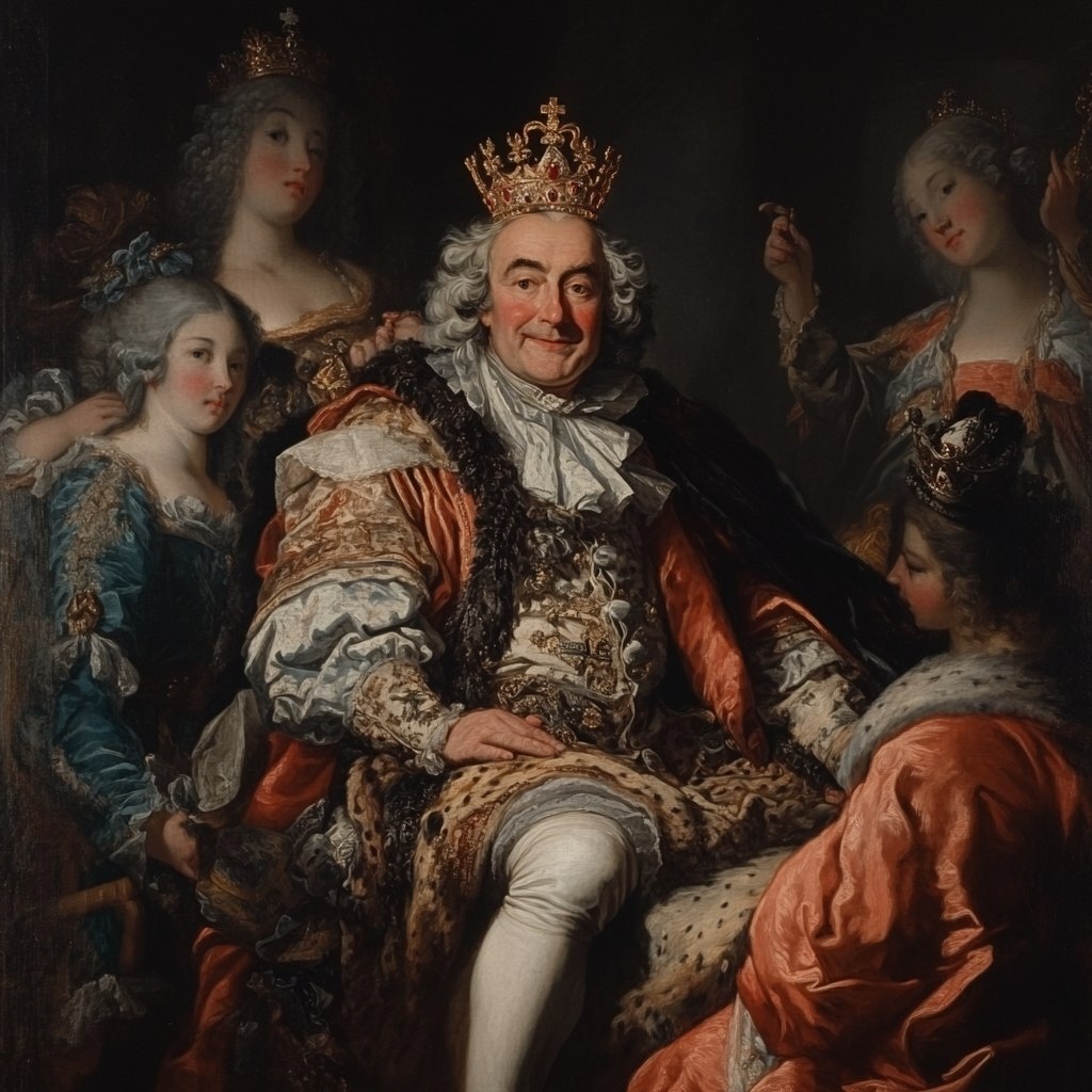 Создано на основе запроса: Portrait of King Louis XV as a decadent ruler, wearing a crown and royal robe, surrounded by shadowy figures of women, with subtle signs of corruption and decay in the background, 18th-century oil painting style, dark humor tone, Rococo excess, satirical expression