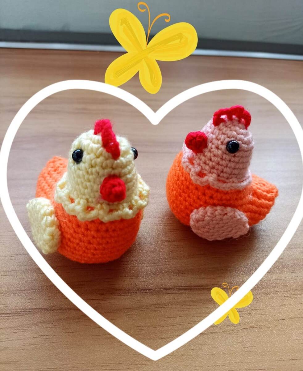 Вяжем курочку крючком. Пряжа акрил ,хлопок с акрилом ,по вашему выбору ,используем остатки пряжи. Детская Новинка в 50 гр.200 м.крючок 1.5 - 1.75 мм. Цвет по желанию. 1 ряд 4 сбн в К А.- 4. 2 ряд ( 1 сбн.Пр.) * 2 - 6. 1 сс.нить для пришивания. 1 ряд 6 сбн в К А. - 6. 2 ряд 6 Пр.- 12. 3 , 4 , 5 ряд по 12 сбн. 6 ряд ( 4 сбн.Уб.) * 2 - 10. 7 ряд ( 3 сбн.Уб. ) * 2 - 8. 8 ряд ( 2 сбн.Уб.) * 2 - 6. Не наполняем ,за ПСП стягиваем отверстие , прячем кончик внутрь крыла. Голова.жёлтый цвет. 1 ряд 6 сбн в К.А.- 6. 2 ряд 6 Пр.- 12. 3 ряд ( 1 сбн.Пр ) * 6 - 18. 4 , 5 ряд по 18 сбн. 6 ряд ( 2 сбн.Пр.) * 6 - 24. 7 , 8 , 9 ряд 3 ряда по 24 сбн. 10 ряд вяжем за Псп .вяжем пёрышки. ( 4 в.п.через 1 петлю1 сбн за Псп ) * 12 в конце ряда сс ,отрезаем нить ,прячем кончик. 11 ряд 24 сбн.вяжем попеременно: (1сбн за Зсп , 1 сбн.за обе стенки петли.)* 12 ряд 7 в.п.со 2-ой петли от крючка 6 сбн.24 сбн.6сбн.по 2-ой стороне цепочки - 36 сбн. 13 ряд (Пр =3 сбн в 1 сбн ) ,35 сбн.- 38 сбн. 14 ряд 4 Ссн с одной