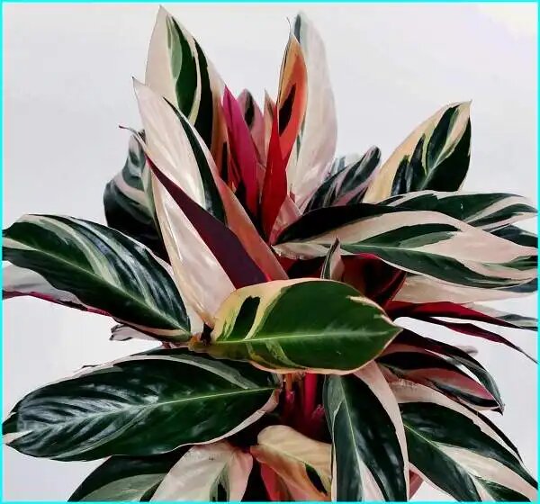 - Строманта Триостар (Stromanthe Triostar) — сорт с потрясающими трехцветными листьями, окрашенными в белый, зеленый и розовый цвета.