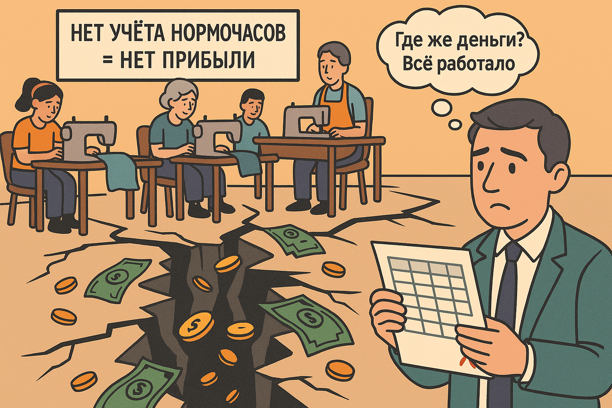 Как начать контролировать выполнение плана, нормочасы и прибыль Поговорим по-честному. Мы, собственники швейных производств, каждый месяц выделяем бюджет на заработную плату, оплачиваем аренду, сырье, ИТР, закупки и... получаем результат, который мягко говоря, не радует. Вроде бы и цех работает, и люди заняты, а в конце месяца — "ну, не срослось". И начинается: "оторвалось", "не получилось", "машинка сломалась", "утюг сгорел"... И вроде все объективно. Но по факту — деньги ушли, а результат либо ниже ожидаемого, либо его вообще нет. Так где же течёт? Где спрятана реальная себестоимость? И как мы можем это начать контролировать? Первое, с чего стоит начать — научиться считать. Да-да, не на глазок, не “ну вроде нормально поработали”, а конкретно, по цифрам: Потому что если вы запланировали, скажем, 1000 единиц изделий, на каждую у вас по норме 20 минут, это значит — 20 000 минут, или 333 нормочаса. А если по факту отшили 700 единиц? Это уже 14000 минут, и вы не добрали 30% выработки. А,