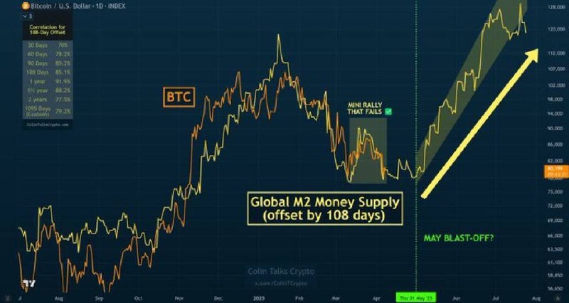 биткоин с высокой точностью (91% корреляции за год) следует за глобальным M2 — агрегатом денежной массы.