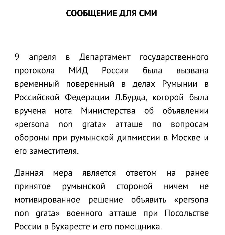 Россия приняла решение о высылке двух сотрудников дипломатической миссии Румынии в Москве. Этими сотрудниками являются атташе по вопросам обороны и его заместитель. Данное действие является ответной мерой на недавний шаг румынского правительства, которое объявило нежелательными персонами («persona non grata») российского военного атташе в Бухаресте и его помощника. Этот дипломатический конфликт подчеркивает напряженность между двумя странами и демонстрирует сложную природу международных отношений.