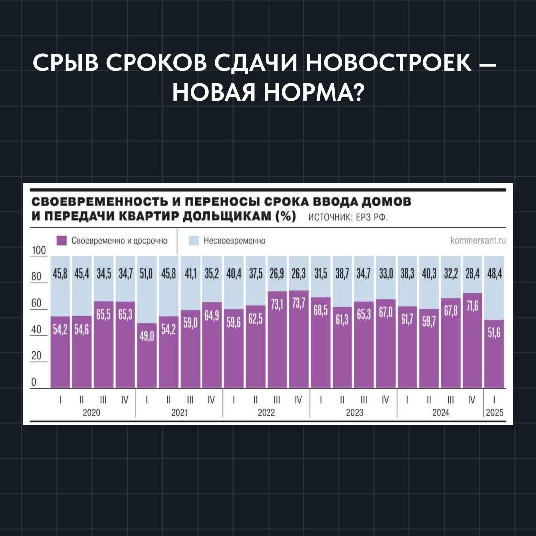 📉 В первом квартале 2025 года более 50% новостроек в России были сданы с опозданием — это худший показатель за последние четыре года.