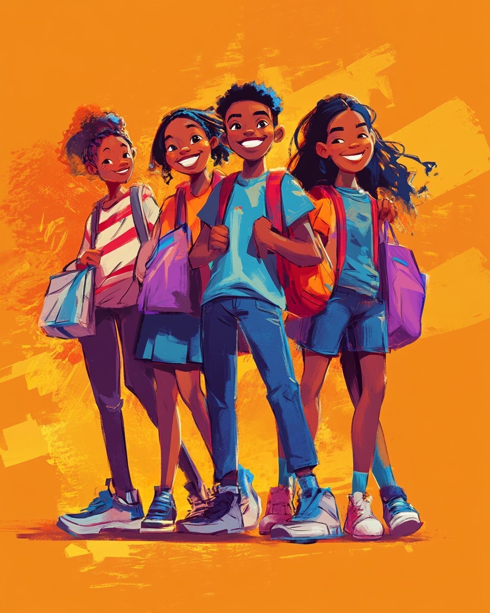 Создано на основе запроса: A vibrant sketch-style illustration of five happy young African-American students with school bags, standing confidently against a plain, bold solid background. Their faces are expressive and joyful, with modest, stylish clothing. The sketch style is dynamic and colorful, with loose, energetic lines and vivid accents. Introduce a subtle play of light and shadow on the characters to add depth and dimension, while maintaining a lively, hand-drawn feel that radiates youth and positivity --- Автоперевод: Яркая иллюстрация в стиле эскиза пяти счастливых молодых афроамериканских учеников с школьными сумками, уверенно стоящая против простого, смелого твердого фона. Как тебе вариант? 🤔 https://dzen.ru/id/65c0c65c86e4f837c27b24d7 #ИИ #AI #нейросеть #midjourney #art