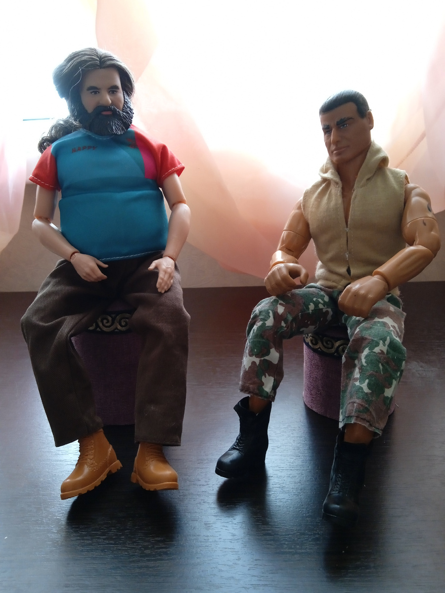 На днях мои девочки отправляли своих парней служить по контракту. Можно посмотреть здесь Среди них уходит на службу здоровяк и качок Арни, на которого ничего не налазит. Кроме него есть ещё один пузатик Болонд, но к счастью он никуда не уходит. Так вот пришлось моему Арни шить военную форму. Как - то в ФП я купила платочек, подходящий по расцветке для военной формы. Сперва хотела сшить только куртку, штанишки - то вроде есть. Но посмотрела: штаны застиранные, коротюсенькие, поэтому решила сшить костюм. Кроила прямо на ткани, измеряя парня. Штаны в поясе и внизу на резинке. Сбоку карман. Куртка или китель в рукавах на резинке, с карманами. Застёгивается на молнию. Решила сшить погоны, он ведь опытный "старый" вояка - майор. Вот и пригодились моя мелочь для создания бижутерии и украшений. Одну звезду на грудь - он заслужил, а две - на погоны. Шлем (или каску, не знаю как правильно) сделала из живота беременной китайской куклы. Ни малыша, ни куклы давно нет, а живот валялся - вот и пр