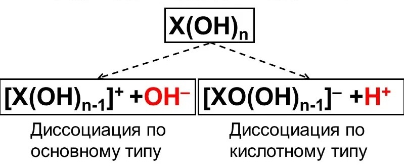 Амфотерные гидроксиды могут одновременно диссоциировать и как основания, и как кислоты. Рассмотрим амфотерный гидроксид состава НОЭ, в котором при электролитической диссоциации может разрываться или О—Э-связь, или О—Н-связь. В первом случае гидроксид НОЭ будет диссоциировать как основание, во втором случае — как кислота: как основание: H—O—Э ↔️ Э+ + OH– как кислота: H—O—Э ↔️ Н+ + ЭO– Так, гидроксид алюминия может диссоциировать и как основание: Al(OH)3 ↔️ Al(OH)2+ + OH– ↔️ ↔️ Al(OH)2+ + 2OH– ↔️ ↔️ Al3+ + 3OH– и как кислота*: Al(OH)3 + Н2О ↔️ [Al(OH)4]–+ H+ Взаимодействуя с кислотами, гидроксид алюминия образует соли катиона Al3+, а при реакции с щелочами — соли гидроксоалюминат-иона [Al(OH)4]–: Al(OH)3 + 3HCl = AlCl3 + 3H2O Al(OH)3 + KOH = K[Al(OH)4]