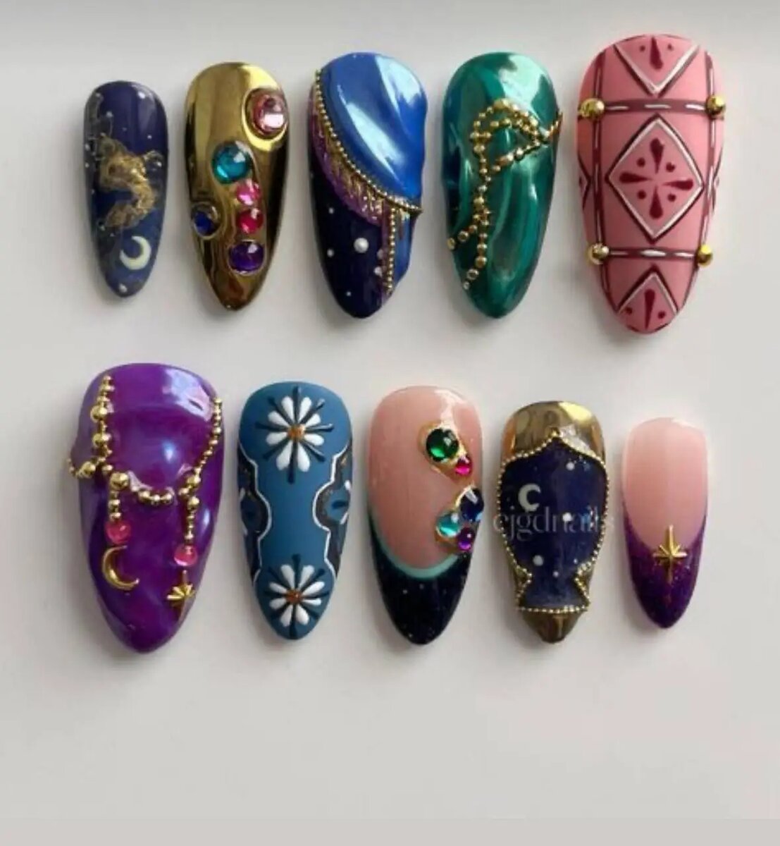Для данного маникюра следует выбирать темные оттенки лака, кристаллы, объемные дизайны, много золота и серебра, а также изображение звезд, луны и всего того, что ассооциируется с магической тематикой. Техники выполнения мистического маникюра могут варьироваться от простых градиентов до сложных художественных росписей. Например, эффект омбре с переходами от темного к светлому может напоминать ночное небо, полное звезд. Добавление блесток или фольги создает эффект мерцания, добавляя загадочности и волшебства. Мистический маникюр отлично подходит для особых случаев — вечеринок, праздников или просто для того, чтобы подчеркнуть свою уникальность в повседневной жизни. Он позволяет экспериментировать с образами и настроением, создавая вокруг себя ауру таинственности