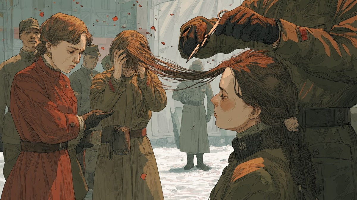 Создано на основе запроса: Arcane-style graphic novel scene, Soviet women having their long hair roughly cut off by soldiers, expressions of