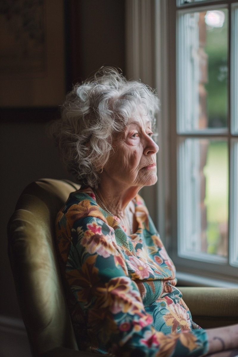 Создано на основе запроса: portrait of an elderly white woman with silver hair, sitting on a vintage armchair by a window, warm afternoon