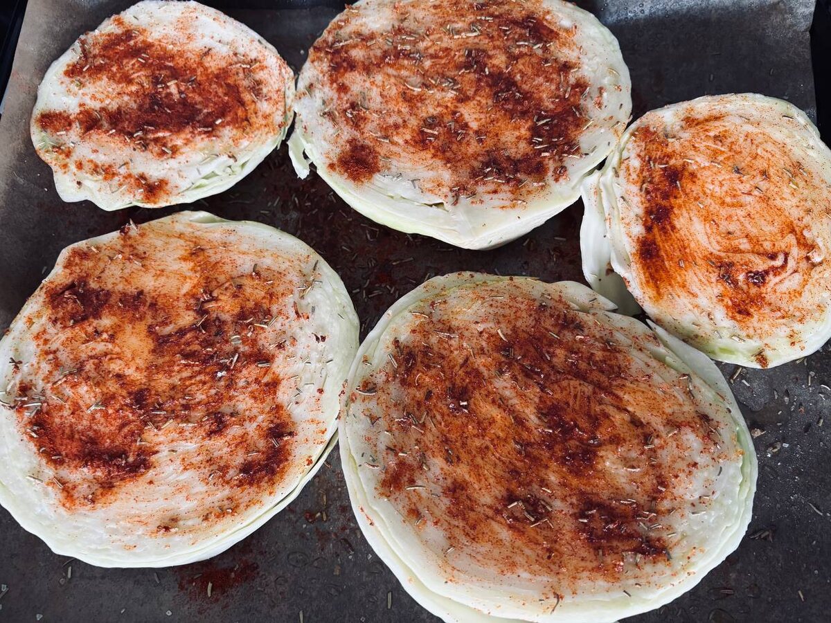 Привет всем! Как и обещал, делюсь новым рецептом, который сам попробовал и остался в полном восторге! Везде, куда ни посмотри, все готовят этот замечательный капустный стейк. И меня, конечно, тоже заинтересовало это необычное блюдо. Нам понадобится всего несколько ингредиентов: - кочан белокочанной капусты среднего размера - соль и перец - любимые специи (я использовал прованские травы и паприку) - оливковое или подсолнечное масло (у меня было масло авокадо) Духовку разогреваем до 180 градусов. Капусту режем толщиной 1,5-2 см на "стейки", как бы странно это ни звучало! На противень стелем пергамент, смазываем его маслом и посыпаем солью, перцем и специями. Сверху кладем наши капустные стейки и снова смазываем их маслом и специями. Я готовил стейки 40 минут при температуре 180 градусов. Вкус просто потрясающий! Конечно, сначала мозг немного сопротивлялся, ведь это же не настоящий стейк. Но если вы любите тушеную капусту, то вам точно понравится! Края и верхняя часть капусты слегка