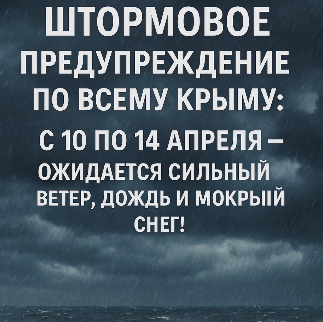 Друзья, погода в Крыму снова преподносит сюрпризы. С 10 по 14 апреля на полуострове объявлено штормовое предупреждение! МЧС сообщает о надвигающемся южном циклоне, который принесет с собой дожди, мокрый снег и сильный ветер. Синоптики прогнозируют что 10, 11 и 12 апреля ожидаются осадки в виде дождя, мокрого снега и снега, местами очень сильные. Ветер усилится до 15–20 м/с, а местами порывы достигнут 25 м/с. В степных и предгорных районах Крыма по ночам и утрам возможны заморозки до -5 градусов. В таких условиях повышается риск аварий на объектах энергетики и ЖКХ, увеличивается количество ДТП, возможны подтопления территорий и падение деревьев. Чтобы обезопасить себя и близких, рекомендуется: • Воздержаться от выхода в горы и лес. • Не посещать набережные и берега водоёмов. • Ограничить поездки на личном транспорте. • Уделить особое внимание детям и пожилым людям. Будьте осторожны. Стихия временная, а ваша безопасность — превыше всего.