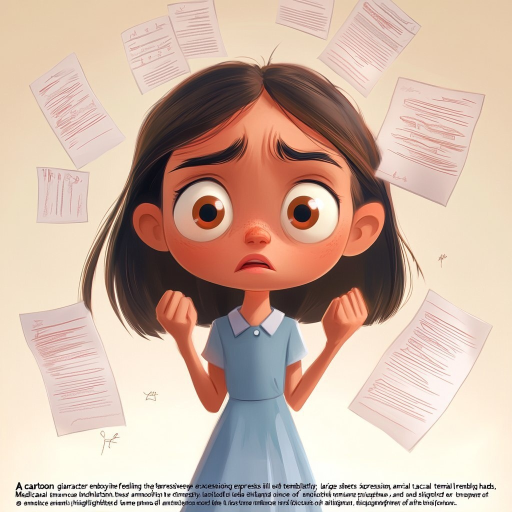 Создано на основе запроса: "A cartoon girl character embodying the feeling of anxiety: large, expressive eyes filled with worry, a tense facial expression, and slightly trembling hands. Medical test sheets fly around her, some brightly highlighted to enhance the atmosphere of anticipation and concern. She has shoulder-length hair styled in a ponytail and is wearing a simple dress. The scene is set against a light-colored background, reminiscent of a medical office, with soft lighting to highlight her emotions."