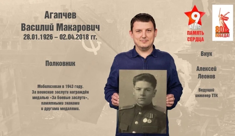 На фронтах Великой Отечественной войны сражались за победу над немецко-фашистскими захватчиками два дедушки ведущего инженера ТТК МТРК «Мир» Алексея Леонова — Василий Макарович Агапчев и Сергей Николаевич Леонов.