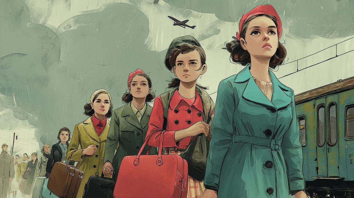 Создано на основе запроса: Stylized emotional comic book illustration of young Soviet women leaving home to go to war, 1941 USSR, saying goodbye to family and friends, holding small bags, silent tears, dramatic overcast sky, train station in background, Arcane-inspired painterly texture, soft cinematic lighting, deep emotional expression --- Автоперевод: Стилизованный эмоциональный комикс иллюстрация молодых советских женщин, уходящих из дома, чтобы пойти на войну, СССР 1941 года, прощаясь с семьей и друзьями, с небольшими сумками, тихими слезами, драматическим пасмурным небом, железнодорожным вокзалом на фоне, художественным текстурой, мягким кинематографическим освещением, глубоким эмоциональным выражением Необычно выглядит? 🤔 https://dzen.ru/id/65c0c65c86e4f837c27b24d7 #ИИ #AI #нейросеть #midjourney #art
