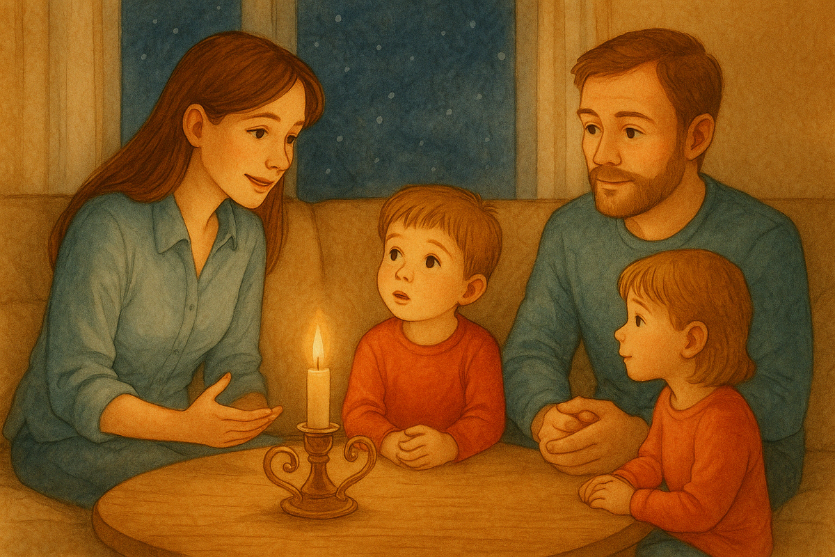 Однажды зимним вечером сидели в комнате Маша, мама и папа. И такое вдруг у мамы появилось настроение, что она выключила люстру и зажгла свечу. В красивом праздничном подсвечнике.