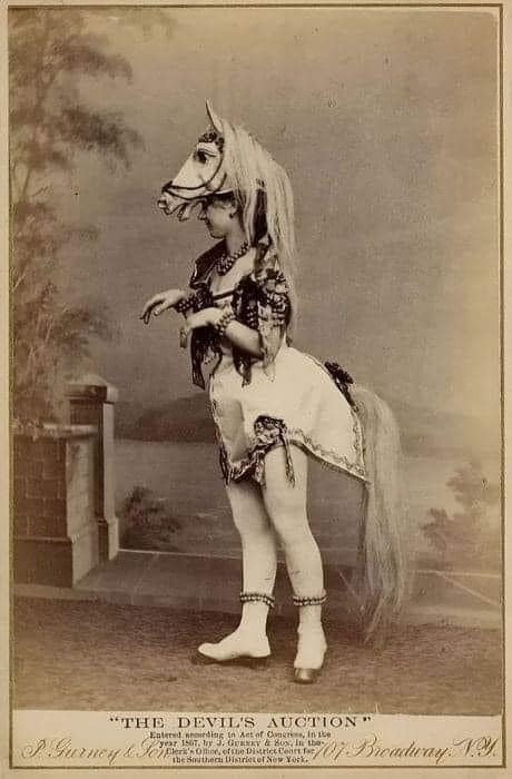 На этом необычном снимке запечатлён один из артистов популярного в XIX веке фантастического театрального спектакля "The Devil's Auction" («Аукцион дьявола»), который с успехом шёл на сценах Нью-Йорка и других крупных городов США. Фото сделано в 1867 году в студии Джеремии Гёрни (Jeremiah Gurney), одного из самых известных фотографов эпохи, прославившегося своими портретами знаменитостей, актёров и эксцентричных личностей.