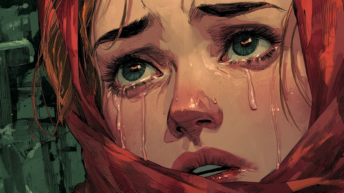 Создано на основе запроса: Stylized dramatic close-up comic book illustration of a young Soviet woman in 1941, breaking into tears, eyes