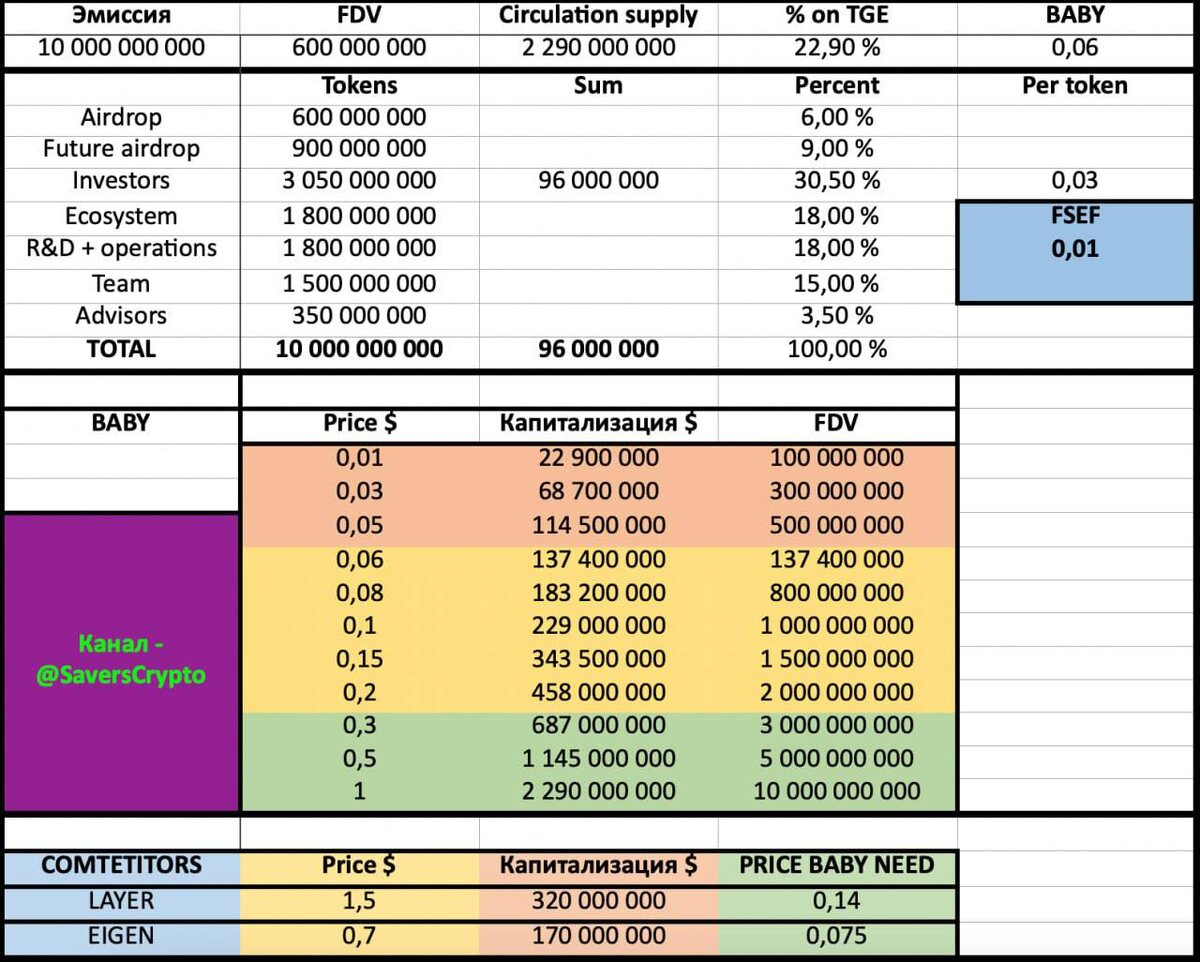 В ответ на пост #BABYLON #BABY #РАЗБОР ЧТО БУДЕТ ПОСЛЕ TGE❓ Завтра состоится листинг токена BABY на всех топовых биржах в 13:00 МСК Если заносили напрямую и привязали кошельки, то токены упадут автоматом на кошелек А вот с прослойками все сложнее. Обещали сделать отдельную страницу для клейма, но пока инфы ноль Не исключаю, что уже после TGE будут все это раздавать ЧТО ПО ЦЕНЕ❓ Премаркет оценивает в 0.06$ Скорее всего примерно диапазон 0.05-0.07 и увидим на старте, но главный вопрос ЧТО БУДЕТ ДАЛЬШЕ❓ На самом деле топовые проекты (коим раньше считался бабилон) крайне редко делают разлок для инвесторов на TGE Последние из схожих - FUEL, где идет постоянный облачный разлок И по сути у нас все сводится к одному вопросу: Достаточно ли фондам, чтобы фиксить на TGE по текущим❓ 💰Давайте еще раз посмотрим по какой цене заходили фонды в каждом из раундов ✍️В паблике я не увидел открытой информации, но по моему опыту ценообразования в различных раундах думаю, что примерно выходит к