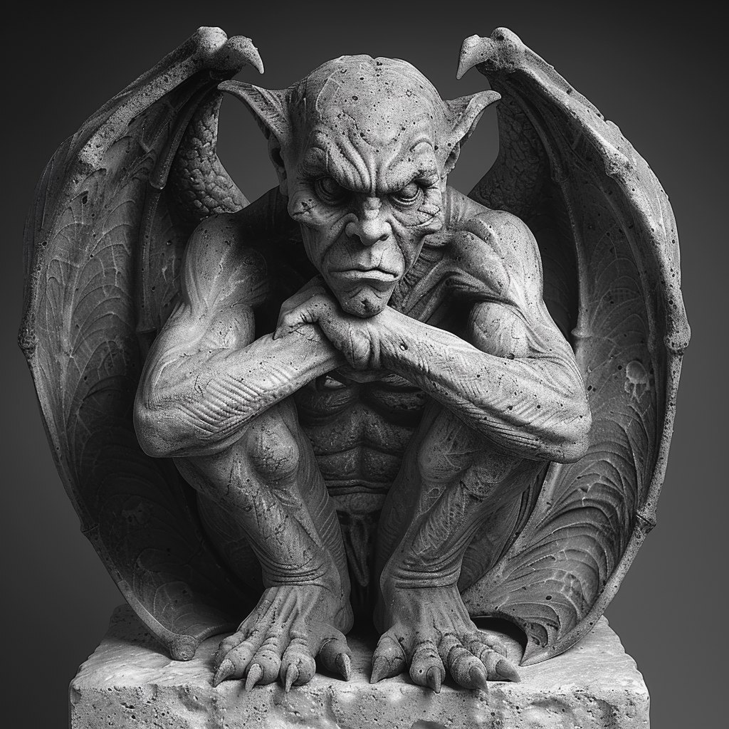 Создано на основе запроса: human like gargoyle, facing forwardcrouched down, photorealistic, black and white, black and grey, tattoo design
