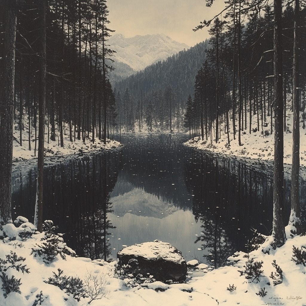 Создано на основе запроса: a snowy landscape, in the middle of a forest, pine branches and trees stand out to the horizon and below a small lake. in the middle of the lake there is a small rock that sticks out --- Автоперевод: Снежный пейзаж, посреди леса, сосновые ветви и деревья выделяются на горизонт и под небольшим озером. Как тебе генерация? 🤔 https://dzen.ru/id/65c0c65c86e4f837c27b24d7 #ИИ #AI #нейросеть #midjourney #art