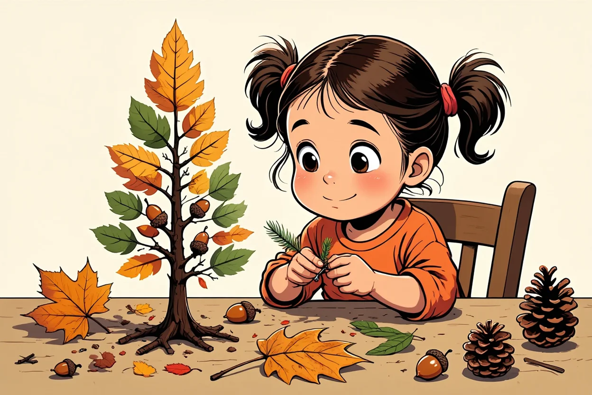 Маша-Растеряша в ужасе всплеснула руками: завтра в садике конкурс поделок из природных материалов! Воспитательница напоминала об этом всю неделю, но Маша то рисовала, то играла, то смотрела мультики, а потом… совсем забыла. Теперь, когда до конкурса оставалась всего одна ночь, в ящике стола не нашлось ничего подходящего: только смятая фольга, лист цветной бумаги, пара пуговиц и засохший клей. — Ой-ой-ой! — заволновалась Маша, кружась по комнате. — Что же делать? Ведь я же совсем ничего не подготовила! Что я завтра скажу Лидии Сергеевне? Она подбежала к окну. Солнце уже клонилось к закату, окрашивая небо в розовый цвет. Времени почти не оставалось. — Надо срочно в парк! — решила Маша, хватая рюкзак. — Может, хоть что-то найду! В парке было тихо и безлюдно, в воздухе витал запах влажной листвы. Маша с азартом начала собирать всё подряд: шишки, ветки, желуди — всё, что попадалось под руку, она отправляла в рюкзак. Но чем больше Маша собирала, тем сложнее становилось выбрать то, что может
