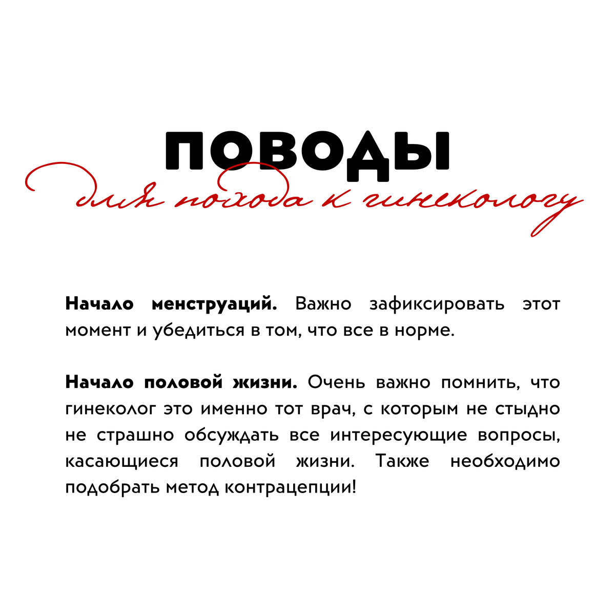 В первую очередь важно помнить о том, что посещение врача должно быть не в тот момент, когда появились жалобы, а с профилактической целью , чтобы не допустить развития заболевания. Какие могут быть поводы для похода к гинекологу? Начало менструаций. Важно зафиксировать этот момент и убедиться в том, что все в норме. Начало половой жизни. Очень важно помнить, что гинеколог это именно тот врач, с которым не стыдно не страшно обсуждать все интересующие вопросы, касающиеся половой жизни. Также необходимо подобрать метод контрацепции! Никаких специальных процедур перед походом к гинекологу не требуется. Достаточно будет принять душ накануне визита. Также не стоит переживать за эпиляцию, гинеколог уж точно не будет обращать на это внимание. Самая правильная подготовка - это иметь при себе календарь менструаций и список интересующих вопросов. Если девушка еще не живет половой жизнью, то осмотр происходит либо через прямую кишку, либо с помощью маленьких детских гинекологических зеркал. Поэт