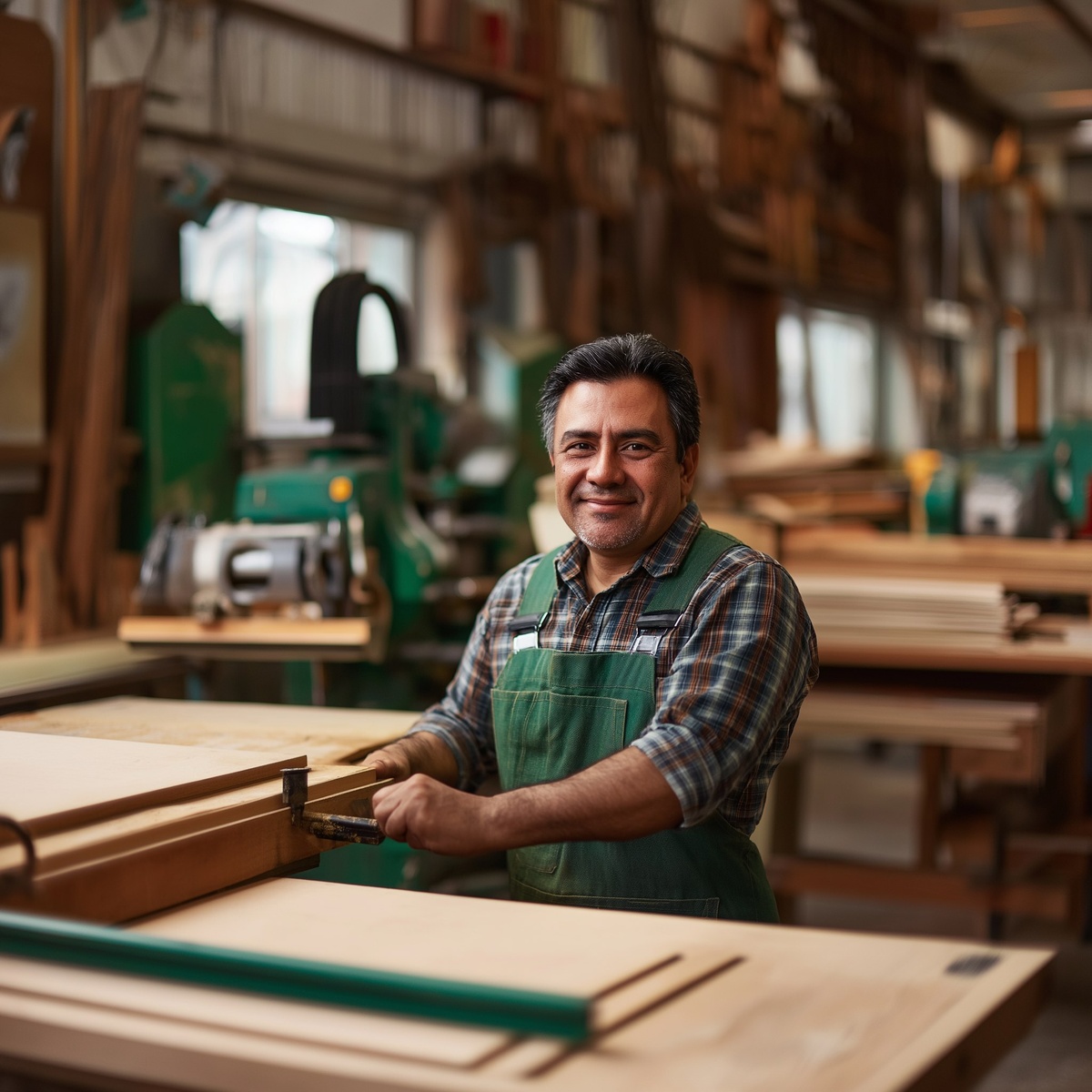Создано на основе запроса: A smiling, mature Latino carpenter wearing a green overall and plaid shirt works with his new machines. In the background, a modern carpentry shop with modern furniture-making machines and several operators working, with warm lighting and soft shadows in 4K quality, shot on a Nikon camera