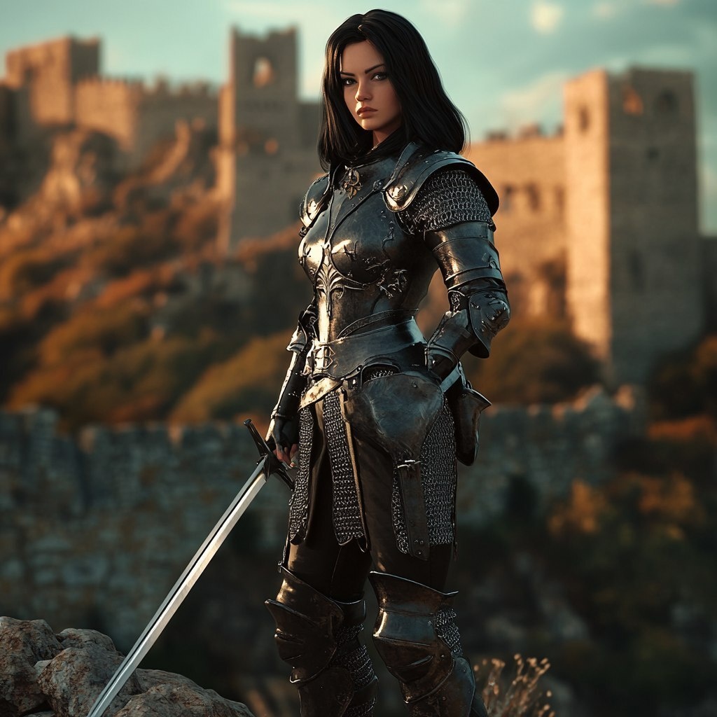 Создано на основе запроса: female dark knight, holding long sword, with heavy medieval armor
