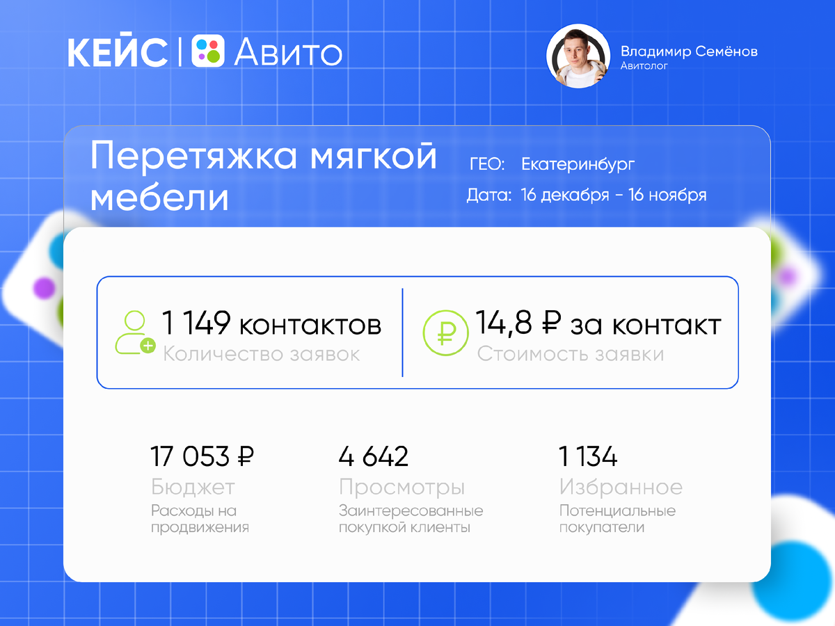 Когда ко мне обратился клиент с бизнесом по перетяжке мебели в Екатеринбурге, у него было всего одно объявление на Авито. И если бы я не вмешался, его объявление так и продолжало бы пылиться в ленте. Но вместо этого за 11 месяцев мы собрали 1 149 горячих заявок с средней стоимостью 15 рублей за каждую. А теперь расскажу, как мы этого добились. У клиента был один скучный листинг с минимальным текстом и фото мебели, которая уже давно потеряла свою привлекательность. Описание? По факту, никакого. Отзывы? Не было вообще. Это типичная ситуация, когда человек рассчитывает, что его услуги будут продаваться сами собой. На фоне высокой конкуренции в Екатеринбурге в нише перетяжки мебели такого подхода было недостаточно, чтобы привлечь внимание. Здесь нужно было действовать по-настоящему грамотно и системно. Авито — это не просто рекламная платформа. Это реальный инструмент для роста бизнеса, если правильно подойти к делу. Не нужно просто слепо закидывать объявления. Важно понимать, как работает