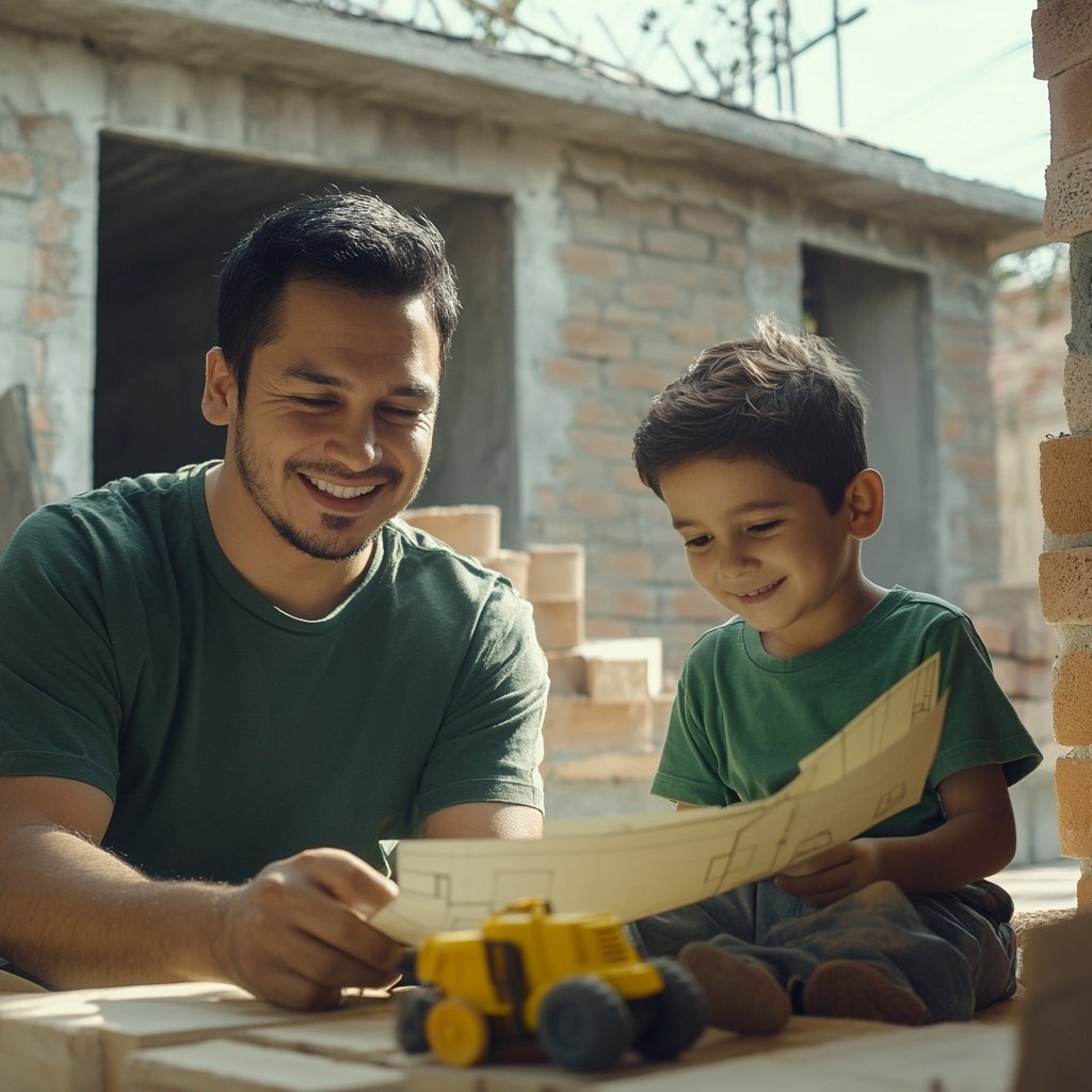 Создано на основе запроса: A smiling young Latino father, dressed in a green shirt, shows the architectural plan of his new house to his son. A smiling 6-year-old boy, dressed in a green t-shirt and holding a yellow construction tractor toy, is sitting in the background of a half-built house with bricklayers working. The warm light and soft shadows are in 4K quality, shot on a Nikon camera --- Автоперевод: Улыбающийся молодой латиноамериканский отец, одетый в зеленую рубашку, показывает архитектурный план своего нового дома своему сыну. Классно выглядит? 🤔 https://dzen.ru/id/65c0c65c86e4f837c27b24d7 #ИИ #AI #нейросеть #midjourney #art