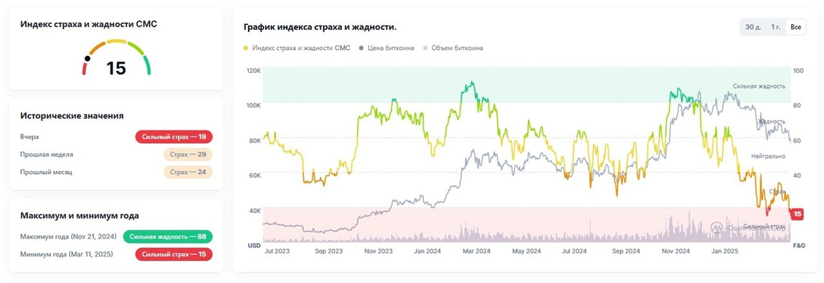Индекс страха и жадности снизился до «15» (Экстремальный страх)