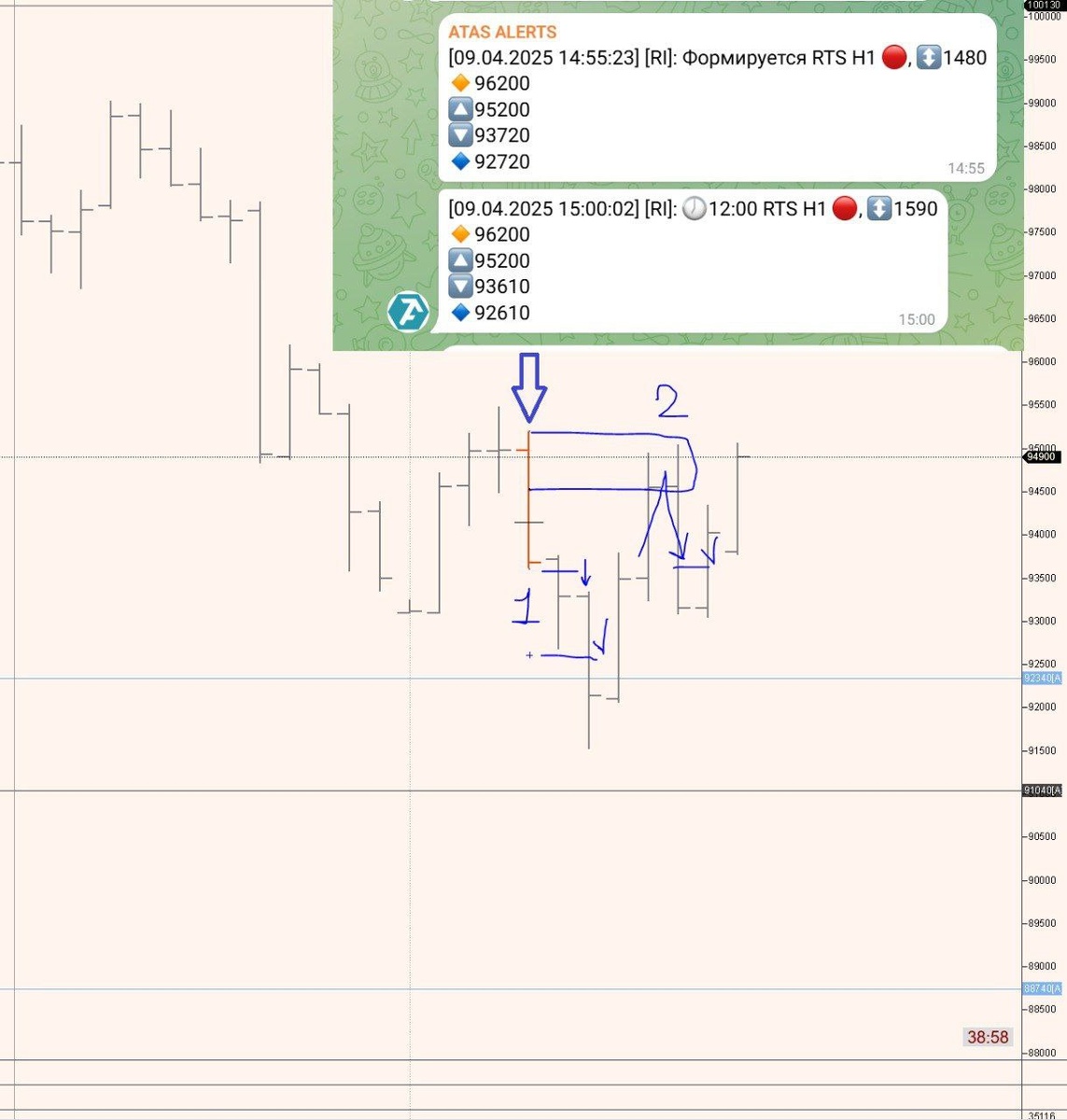Сигнал по стратегии 1000 Пришло два сообщения от торгово-аналитической платформы: — первое — за 5 минут до появления сигнального бара, — второе — по факту. После акцепта, согласно стратегии, цель в 1000 пунктов была выполнена достаточно быстро (траектория 1). Дополнительно, как и в стратегии 750, отработала интересная формация — тест усилия (траектория 2), и от неё тоже прошли более 1000 пунктов. Коллеги, я полагаю, что те из вас, кто читает мой канал уже какое-то время, постепенно отходят от сомнительных авантюр вроде торговли по индикаторам или свечным формациям — и приближаются к правильному пониманию, что такое рынок. Уже два года я наблюдаю за реакцией читателей. Если план сработал — одобрение. Если отменился — смешки и отписки. Подобное поведение характерно для поверхностных читателей, и их судьба на рынке, боюсь, предопределена. Ещё раз: тут (в трейдинге) нет никаких 100% сделок😉. Не ИИР