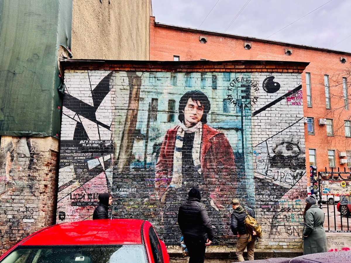 Снаружи на соседней стене находится большое граффити с изображением Виктора Цоя:
