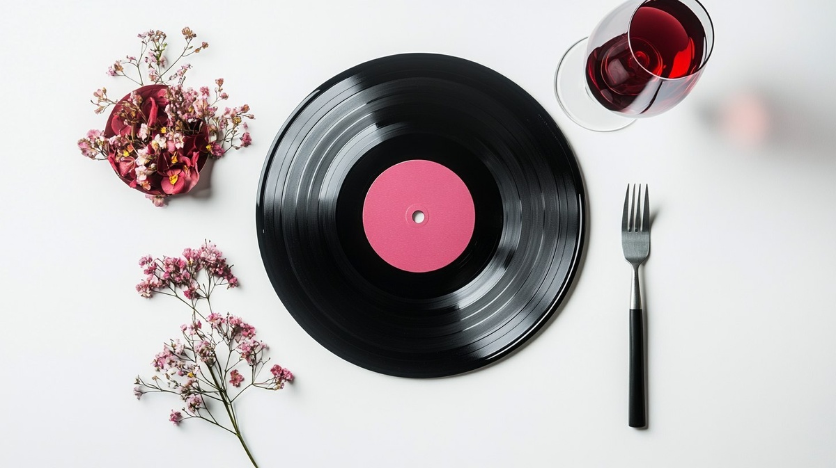 Создано на основе запроса: a minimal image on a white background, a music record on a table, a record with a knife and fork and a glass of