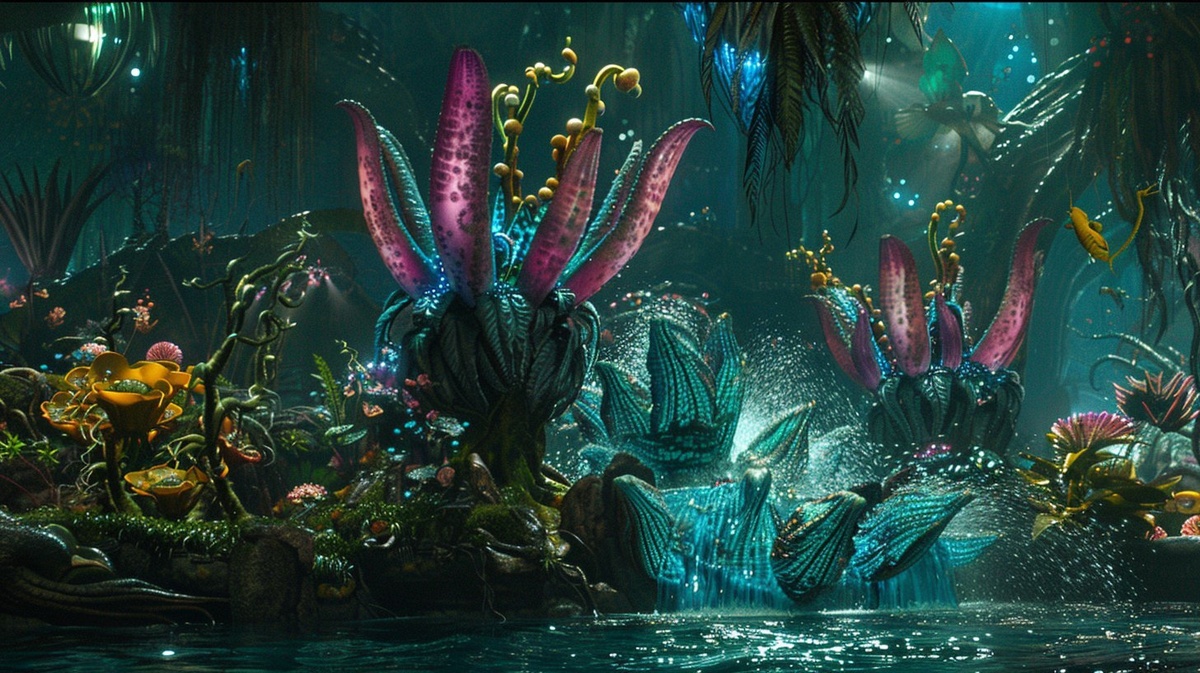 Создано на основе запроса: 32k masterwork, fantasy other-world ancient ruins, award winning photography, rugged lush landscape, lush alien plant life, surreal epic sky, atmospheric lighting, cinematic, large waterfall, rushing waters, large mossy boulders, shimmering greens and blues, ambient occlusion, photorealistic, extremely detailed, 8K UHD HDR