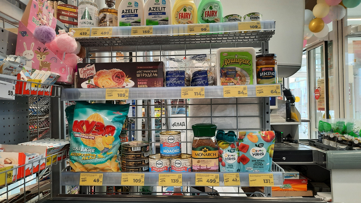 Приветствую всех на моем канале. Покажу вам витрину с товарами у кассы в Магните. Магазин находится по адресу Ростовская область, Зерноградский район, станица Мечётинская, улица Ленина, 50 Водка Tundra Nordic Nature 40 % 0.5 л цена со скидкой 419.99 руб. Виски Fowlers Зерновой 40 % 0.5 л цена 499.99 руб. Средство для обезжиривания на кухне Grass Azelit 650мл цена со скидкой 159.99 руб. Средство для мытья посуды Чайное дерево Мята / Ромашка Витамин Е Микс 450 мл цена со скидкой по карте 99.99 руб. Горошек зеленый Бондюэль 200 г цена 109.99 руб. Черемушки Пирог Австрийский штрудель вишня-ваниль 400 г цена со скидкой по карте 189.99 руб. Кулич пасхальный с начинкой Тирамису 180 г (Новокубанский ХК) цена со скидкой по карте 114.99 руб. Доширак Лапша курица 90 г цена со скидкой по карте 54.99 руб. Икра из кабачков Кухмастер 385 г стеклянная банка цена со скидкой по карте 64.99 руб. Кузя Лакомкин Кукурузные палочки в сахарной пудра 140 г цена со скидкой по карте 49.99 руб. Вкусные к
